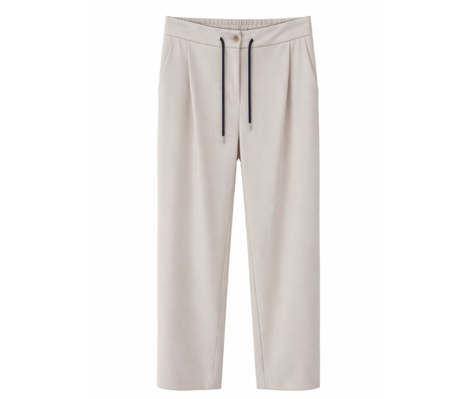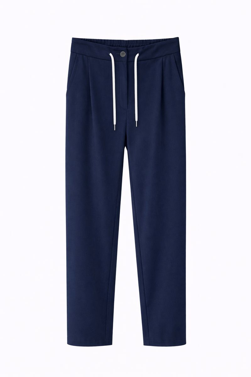 El pantalón presenta cintura con cordón ajustable, pliegues frontales y corte recto, combinando comodidad y elegancia en una sola prenda.