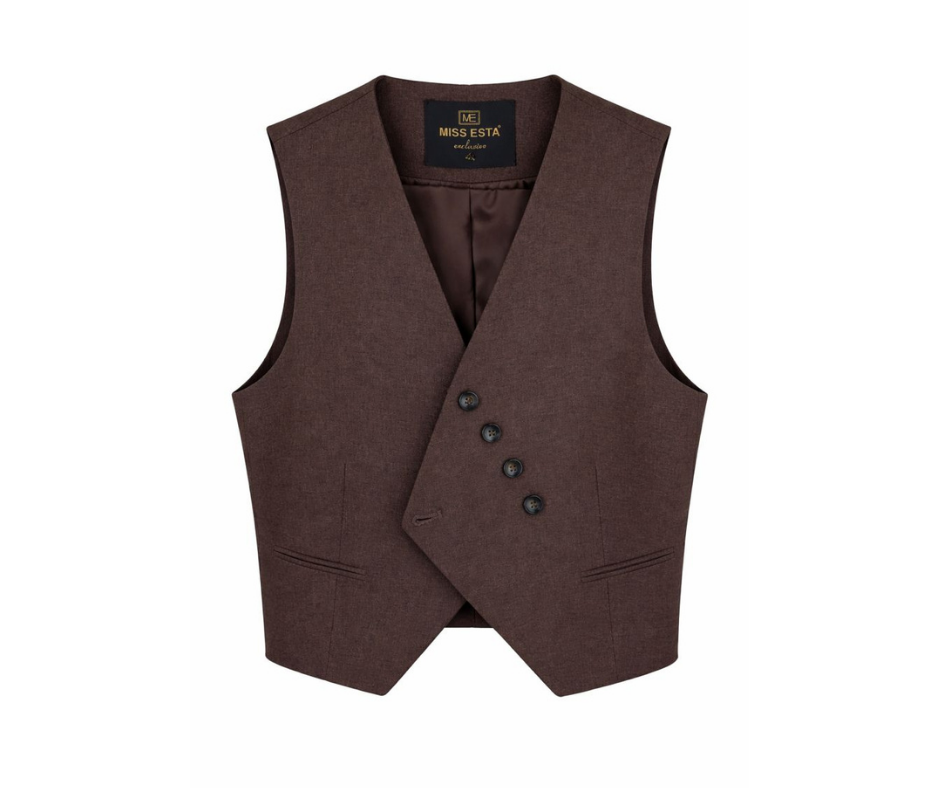 El blazer de corte clásico presenta solapas estructuradas, cierre de dos botones y bolsillos con solapa que aportan una estética pulida y profesional. El chaleco entallado, con botones asimétricos, añade un toque distintivo y estiliza la figura, mientras que el pantalón de tiro medio-alto y pierna recta ofrece una caída elegante y favorecedora.