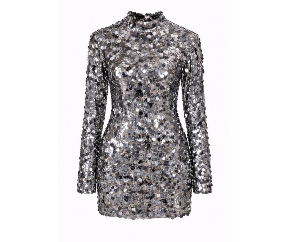 Deslumbra en cualquier evento con este espectacular vestido corto de lentejuelas plateadas, diseñado para realzar tu figura con un acabado sofisticado y glamuroso. Su silueta entallada y su cuello alto estilizan la silueta, mientras que las mangas largas equilibran perfectamente su diseño sensual y elegante.